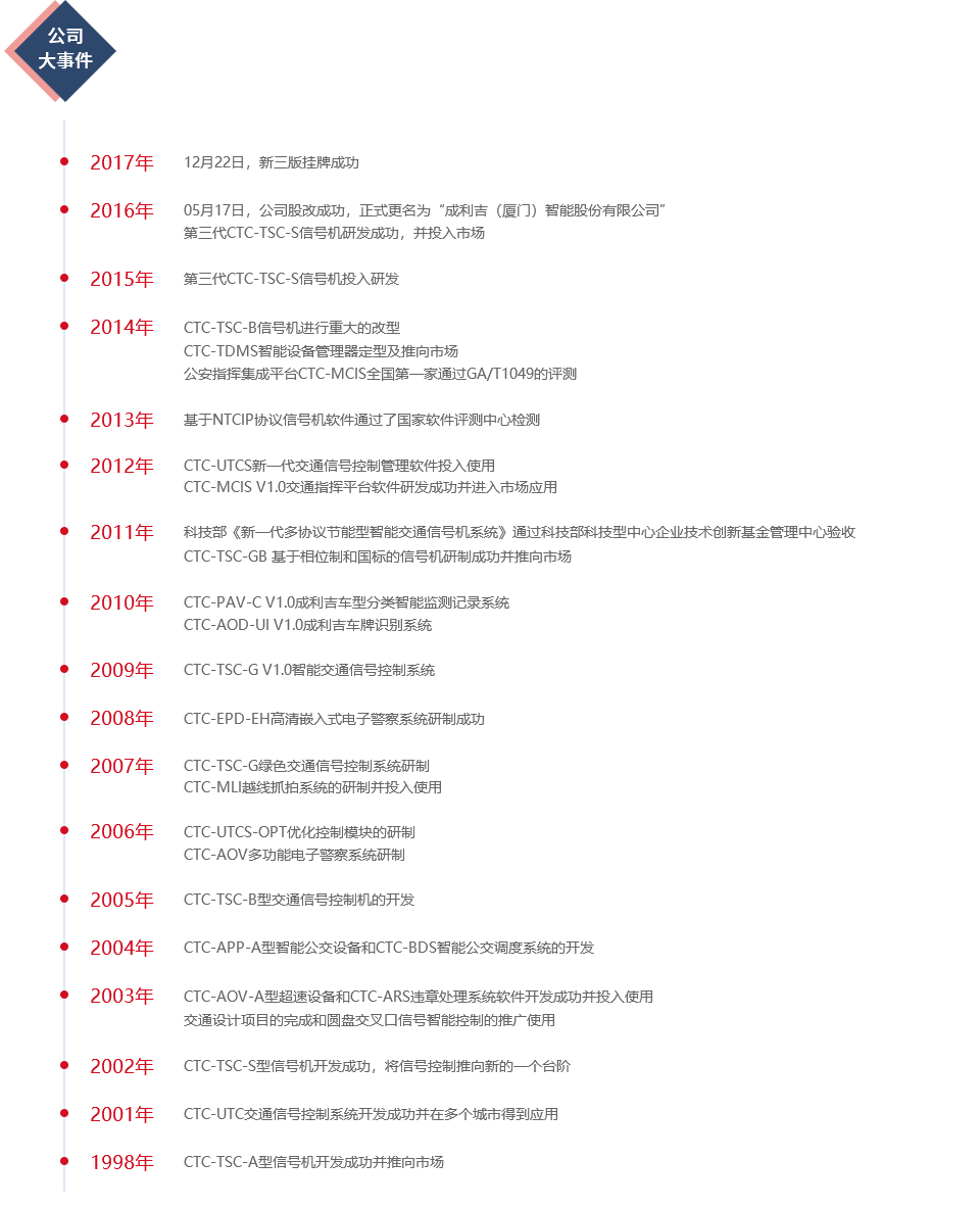 成利吉(廈門)智能股份有限公司,成立于1998年,是國內最早從事智能交通領域產品研發(fā)和應用、專業(yè)智能交通核心軟件開發(fā)、智能交通系統(tǒng)集成與運營服務的企業(yè)之一。公司于2016年5月正式更名為成利吉(廈門)智能股份有限公司,并于2017年12月22日新三版成功掛牌。